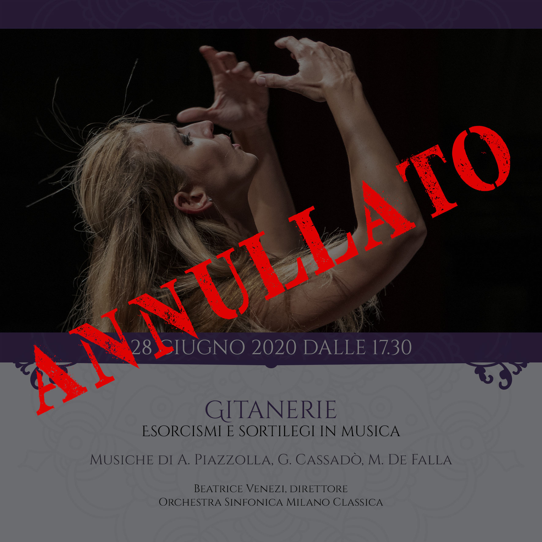 | €10 - €15Occhi brucianti e voce profonda, Lolita irresistibile, fu la sivigliana appena ventenne Pastora Imperio a ispirare la “gitanerie musicale” di Manuel de Falla che per lei scrisse El amor brujo, pantomima di musica, danza, recitazione e canto che non manca mai di ammaliare lo spettatore tra fuochi fatui che danzano, fiamme d’inferno, esorcismi e sortilegi per riconquistare amori perduti, apparizioni fantasmatiche alla luce di deboli candele. Come era stato per Stravinsky, all’alba del Novecento, la ragione vacilla, il mito, arcaico e classico, ritorna protagonista. E arcaiche sono anche le atmosfere di María de Buenos Aires, opera insolita, combinazione affascinante di tradizione “tanghera”, jazz e musica contemporanea, che fu ispirata dalla nostra Milva. È un sottomondo, quello di María, che “…nacque un giorno che Dio era ubriaco”, fatto di ladri e prostitute, mendicanti e spiritisti eppure a suo modo forte di una dignità altra. Una gitana María – come la Candela di De Falla e la Carmen di Bizet – che si autoproclamerà anima stessa del tango e di Buenos Aires, in un’identificazione totale e intima con le radici profonde di una terra, di una danza e di una città.