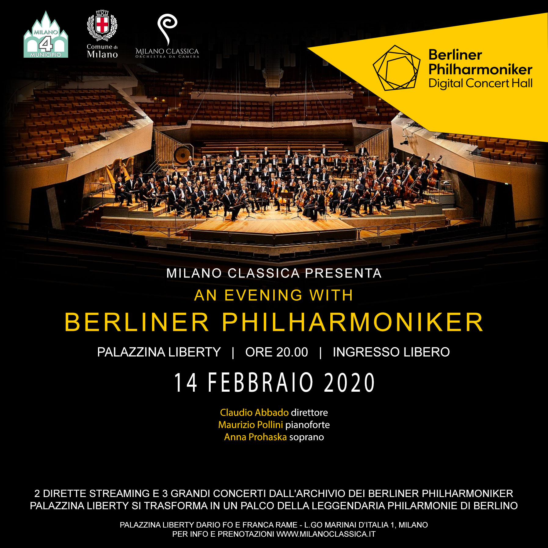 Grazie a un accordo con Digital Concert Hall, il videoarchivio digitale che raccoglie le registrazioni di oltre 800 concerti dei Berliner dal 1966 a oggi, il pubblico della Palazzina potrà assistere – a ingresso libero – alle proiezioni su maxi schermo di 4 concerti della prestigiosa formazione, l’ultimo dei quali, il 12 giugno, in diretta dalla Philarmonie di Berlino.